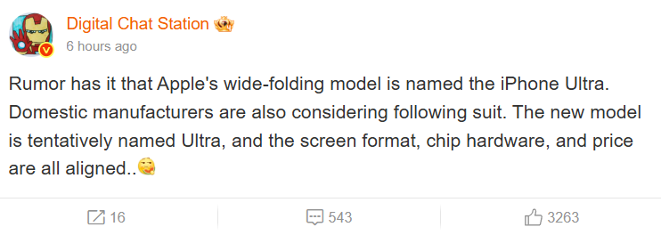 Recent posts on Weibo from Digital Chat Station, who is a well-known and generally reliable tipster, have also started pointing toward a specific name for this wide-format foldable: the iPhone Ultra. While Apple has used the Ultra branding for its most rugged and feature-packed watch, it feels a bit odd to use it here given that the leaks show a device with only two cameras.